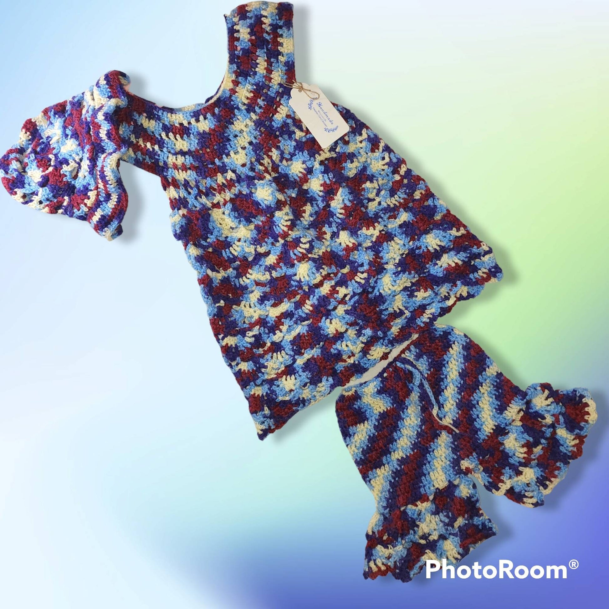 This a crocheted girls dress, hat and shorts for 18 to 24 months old, dress measurements chest 20", shoulder to bottom 22" , shorts waist 17", length 10.5 ", hat 15" , 7" crown to brim. This made of lightweight yarn, great for summer time. Any questions just message me on here, thanks Patricia, TwistedCurlsCrochet